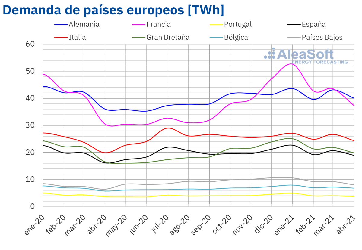 La demanda eléctrica registró subidas interanuales en abril en todos los mercados eléctricos europeos. La causa principal de este ascenso fue la recuperación de la actividad laboral e industrial durante 2021 respecto a la caída histórica por el efecto de la pandemia durante abril de 2020. La mayoría de mercados registró ascensos de la de demanda superiores al 15%, que se elevaron hasta el 22% en los casos de Francia e Italia. Por otra parte, las temperaturas medias fueron inferiores a las de abril de 2020, continuando la tendencia que se ha visto durante todo 2021.