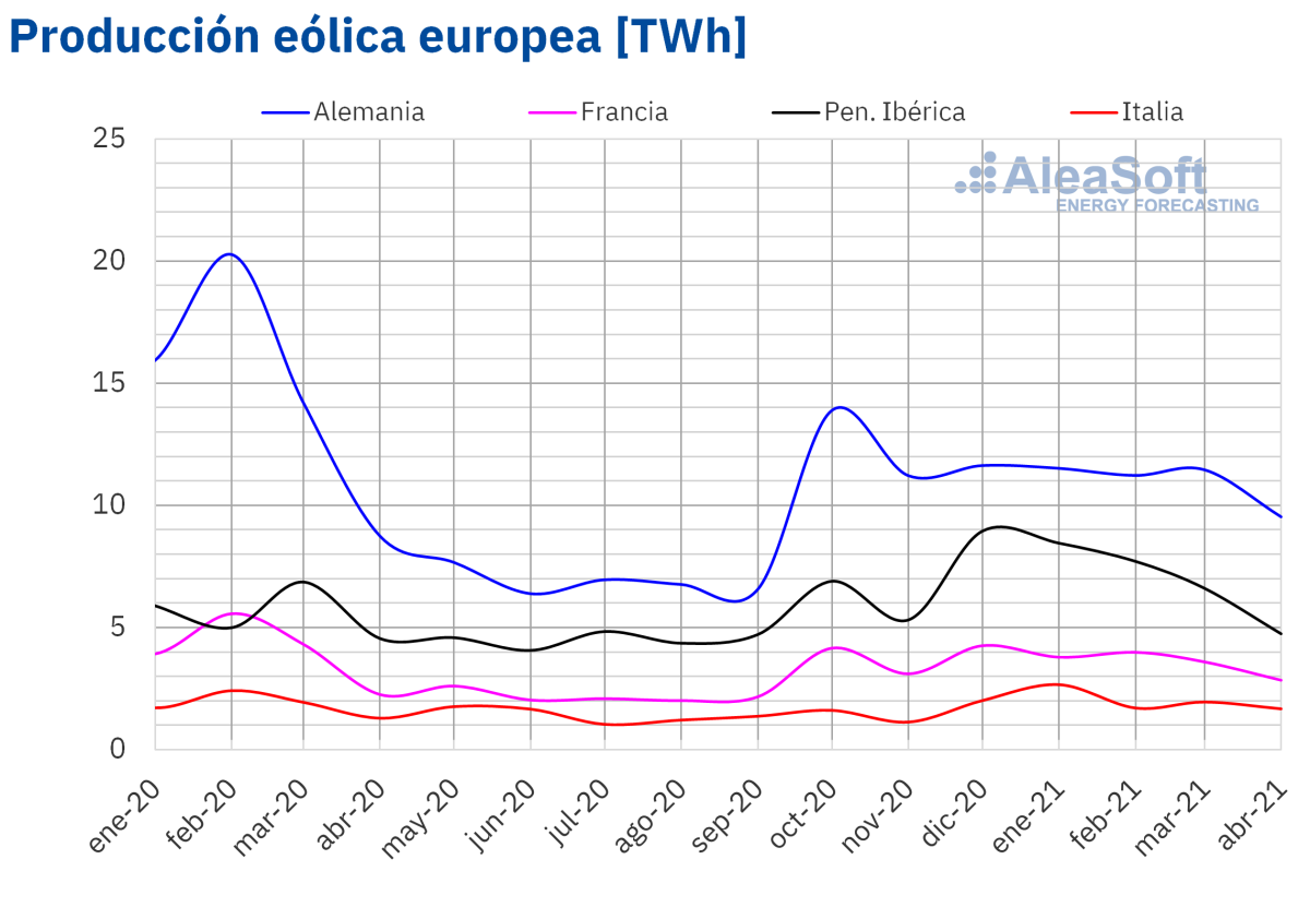 El incremento de los precios del gas y de los derechos de emisión de CO~2~ favoreció la subida de los precios en los mercados europeos en el mes de abril. Aunque la demanda disminuyó respecto al mes anterior, el descenso generalizado de la producción eólica también contribuyó a que los precios fueran mayores a los del mes de marzo de 2021.