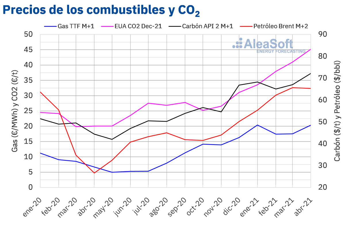 En cuanto a los futuros de derechos de emisión de CO~2~ en el mercado EEX para el contrato de referencia de diciembre de 2021, el día 1 de abril registró el precio de cierre mínimo mensual, de 42,48 €/t. Los precios aumentaron durante el mes de abril, especialmente en la segunda parte del mes. Como consecuencia, el precio de cierre máximo mensual, de 48,84 €/t, se alcanzó el viernes 30 de abril, el cual representó un nuevo máximo histórico.