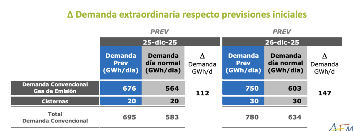 Las bajas temperaturas previstas darán lugar a un incremento extraordinario de consumo de gas respecto a los valores previstos en condiciones normales de 259 GWh entre los días 25 y 26 de diciembre. Los actuales niveles de existencias en tanques de GNL y almacenamientos subterráneos garantizan la cobertura de toda la demanda programada sin ningún problema.