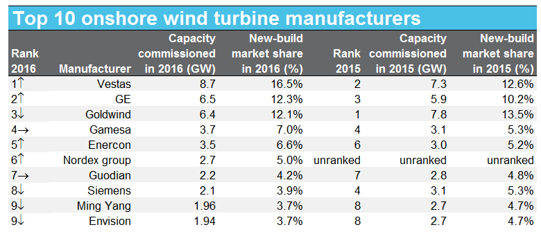 Vestas ha conseguido regresar al primer puesto tras mejorar sus resultados de 2015 y a que la china Goldwind ha tenido mayor competencia en el mercado asiático y ha cedido algo de terreno que le ha llevado incluso al tercer puesto.