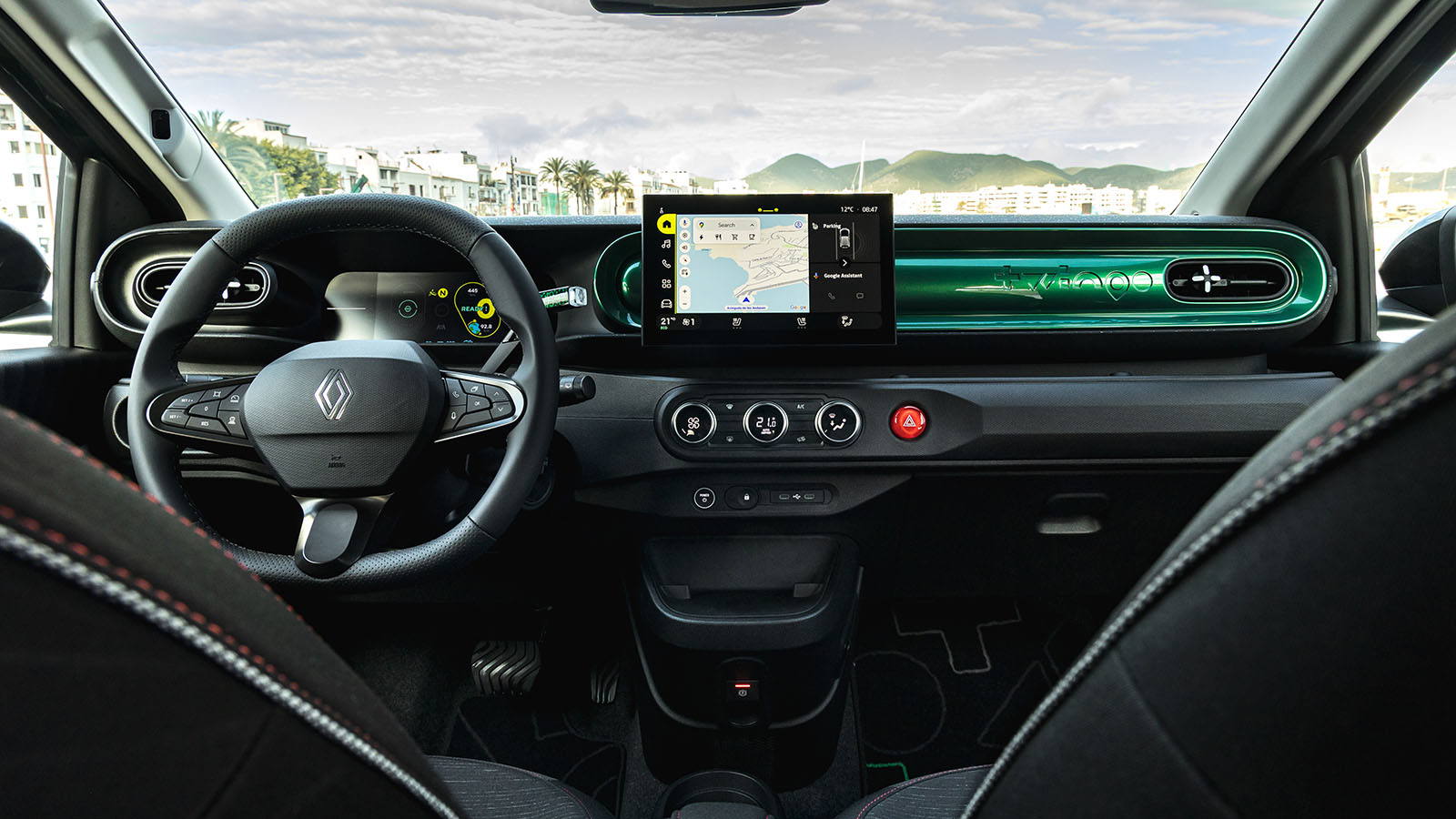 Un puesto de conducción que aquí sí está alejada del Twingo de los 90 tanto por calidad, pues pese al uso masivo de plásticos duros la percepción general es la de estar ante un coche muy bien construido que, eso sí, mantiene guiños estéticos como las coloridas molduras decorativas o la ingeniosa repisa, orientada hacia el pasajero, perfecta para depositar objetos más pequeños.