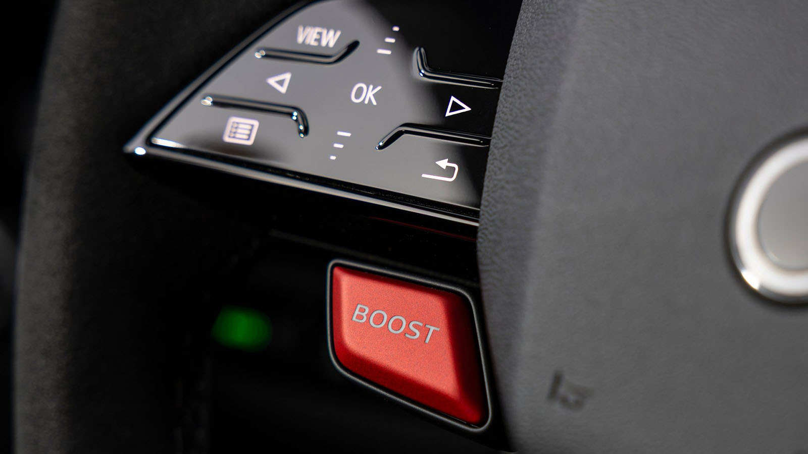 Combinados con un chasis de respuesta inmediata y el reparto total de par gracias a la tracción integral eléctrica, hacen que el coche “plante cara” a cualquier rival directo. El paso por curva es plano y preciso, apoyado tanto en la dirección al eje trasero (que nuestra unidad no montaba) como en unos neumáticos Pirelli de alto rendimiento, y la sensación de aceleración es casi adictiva. Además, el botón “boost” en el volante RS permite liberar todo el potencial del coche durante 10 segundos.