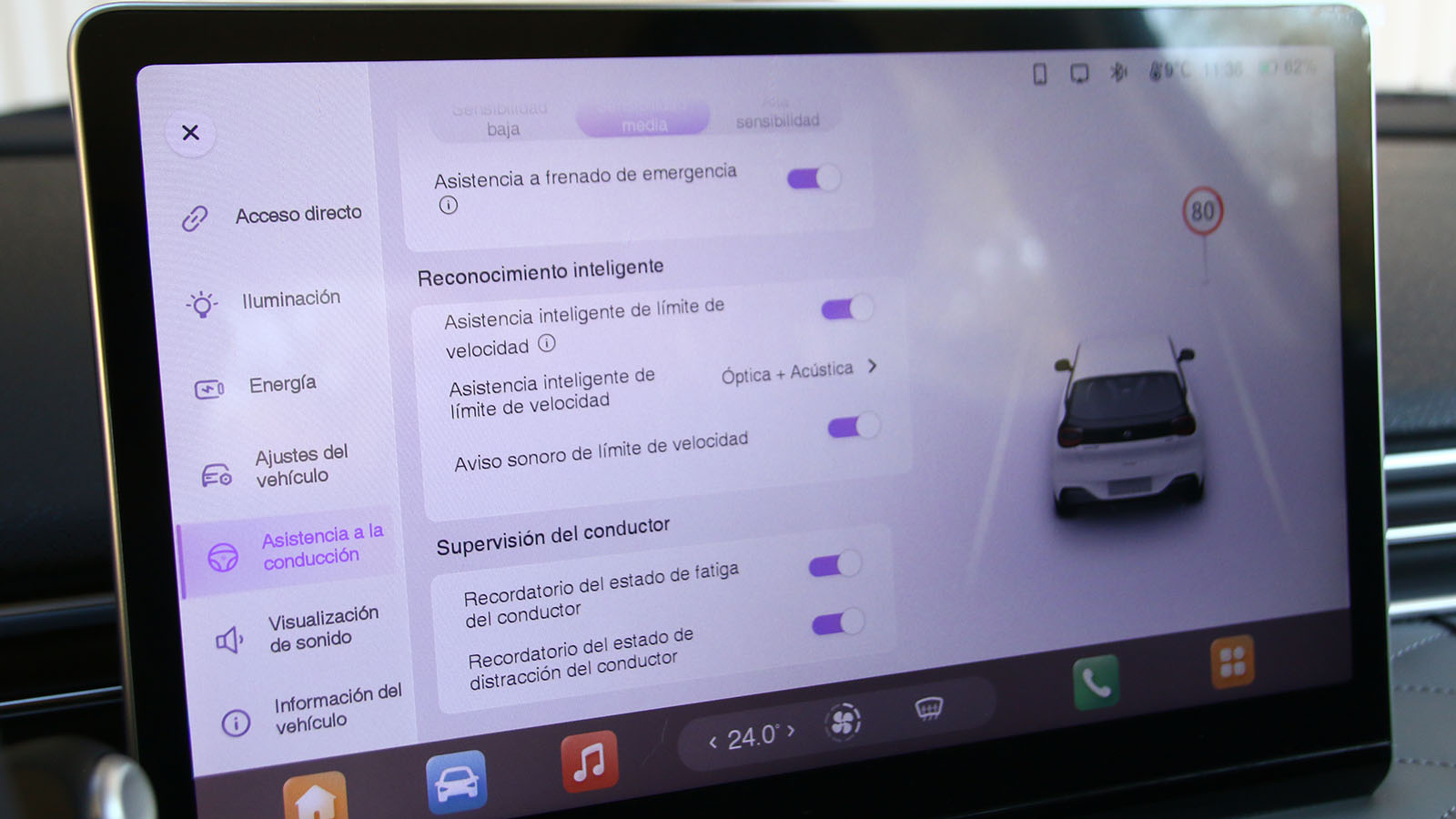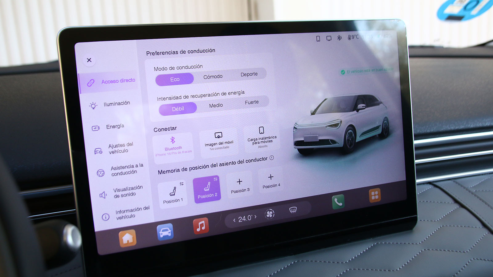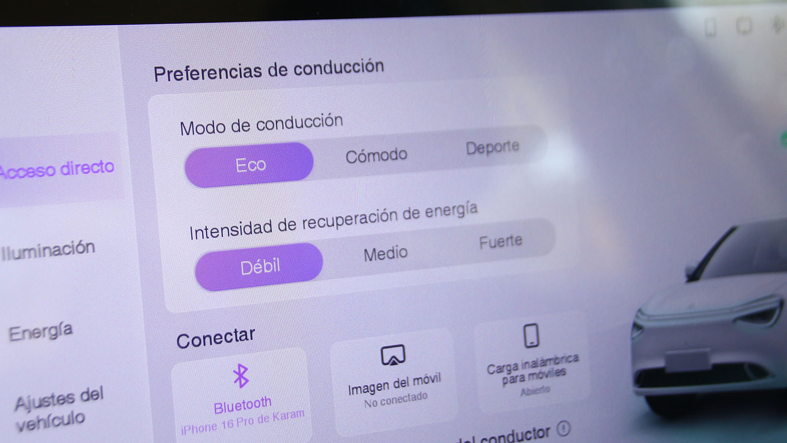 Al volante la sensación es la de tener un coche con escaso empuje si circulamos, como es el caso, por autopista o carretera secundaria, ya que ni siquiera en el modo Sport (Deporte como lo ponen) mejoraba. De hecho, nos ha parecido un vehículo más apto para circular con el modo Eco activado y así conseguir arañar kilovatios, de hecho, con este programa teníamos la sensación de perder incluso potencia.