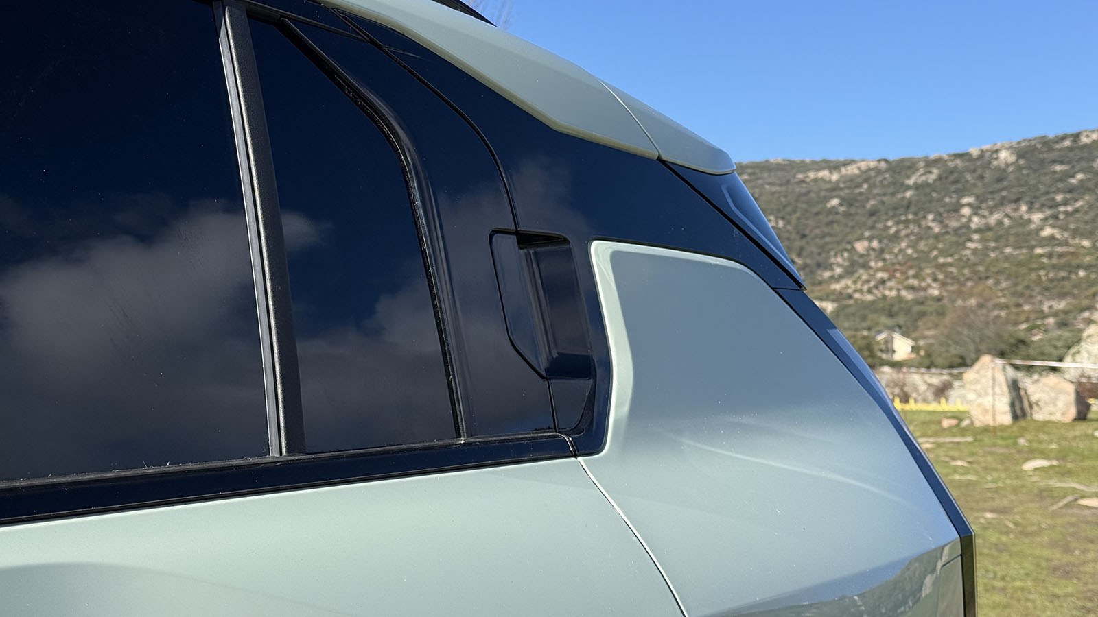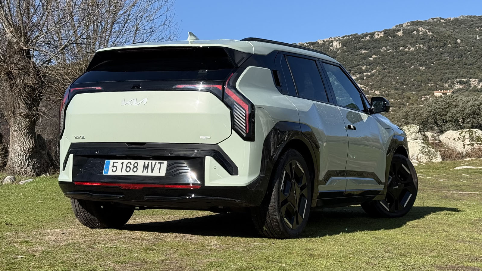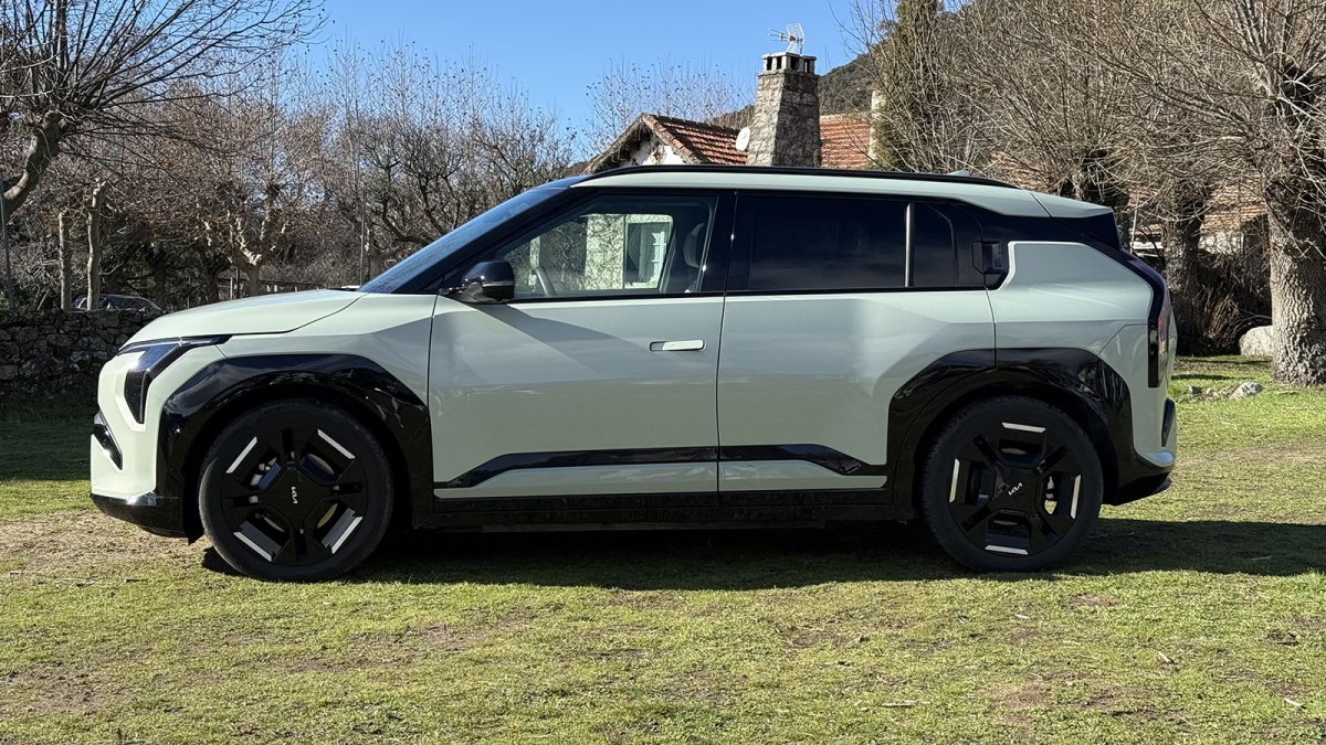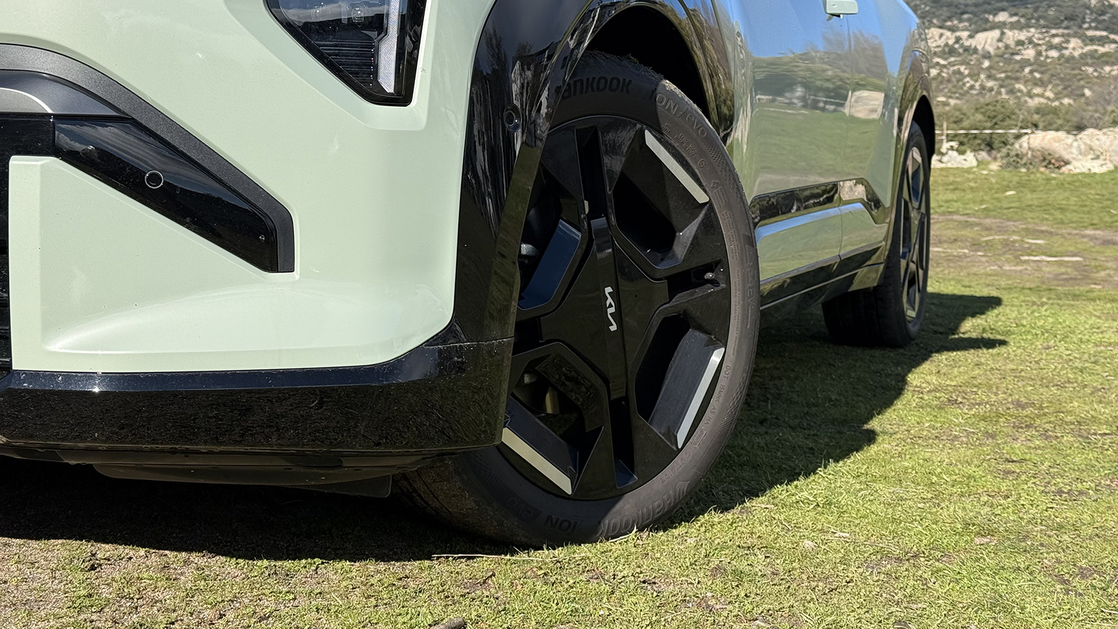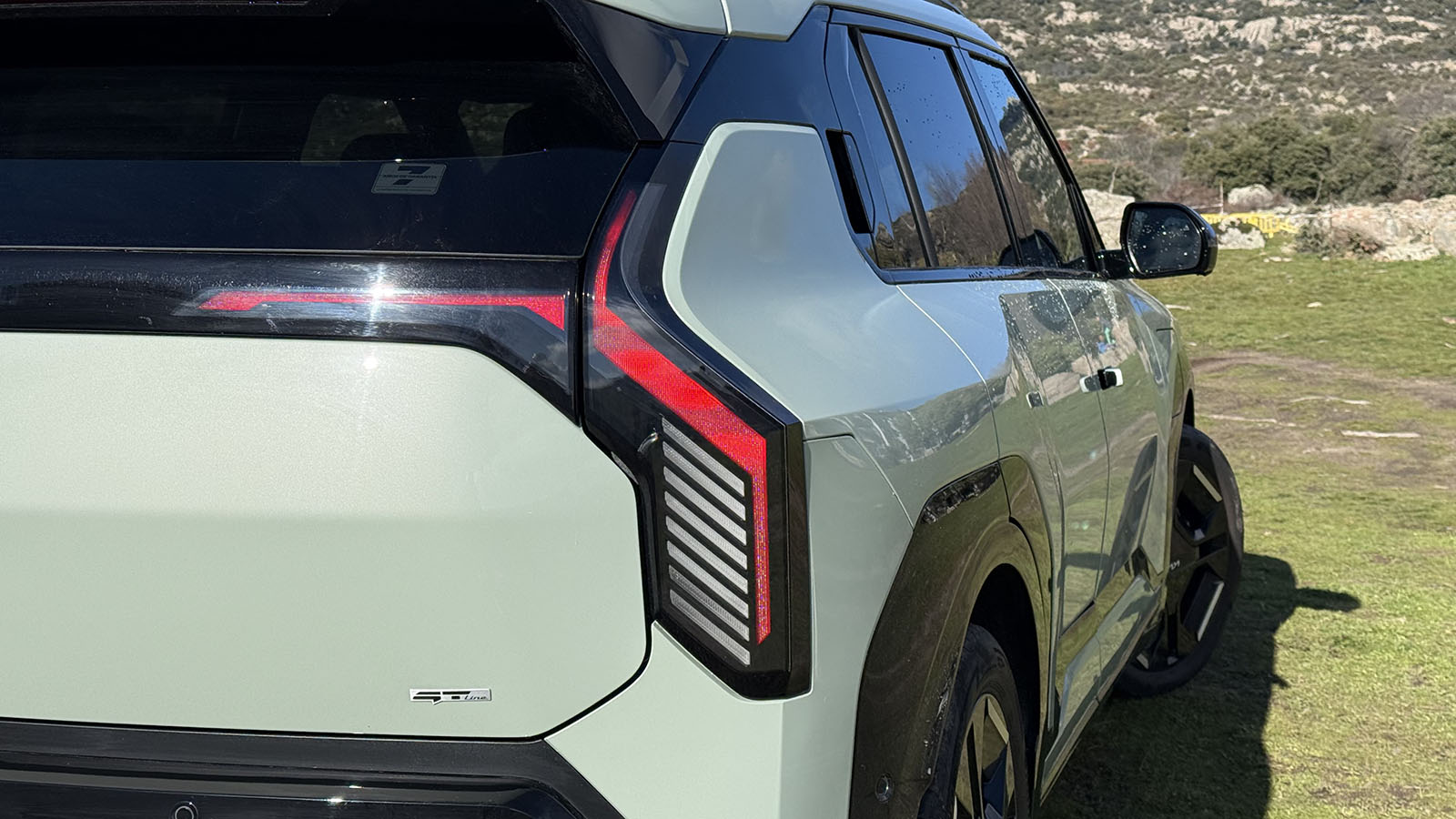 El primero, sus formas y tamaño. Porque con sus 4,30 metros de largo, cota que acompaña de una anchura de 1,85 y una altura de 1,56 metros, podríamos catalogar como un B-SUV grande o un C-SUV pequeño. Para mí son unas cotas perfectas, sobre todo por lo que te voy a mostrar en el interior y además las acompaña de un diseño conocido, no solo por ser fiel al del concept del que deriva, sino por heredar multitud de detalles del EV9 (prueba), tales como los pasos de rueda o la forma de los faros delanteros y trasero. Además, con la versión GT-Line se enfatiza su deportividad con elementos en negro brillante o con unos paragolpes específicos y más pronunciados.
