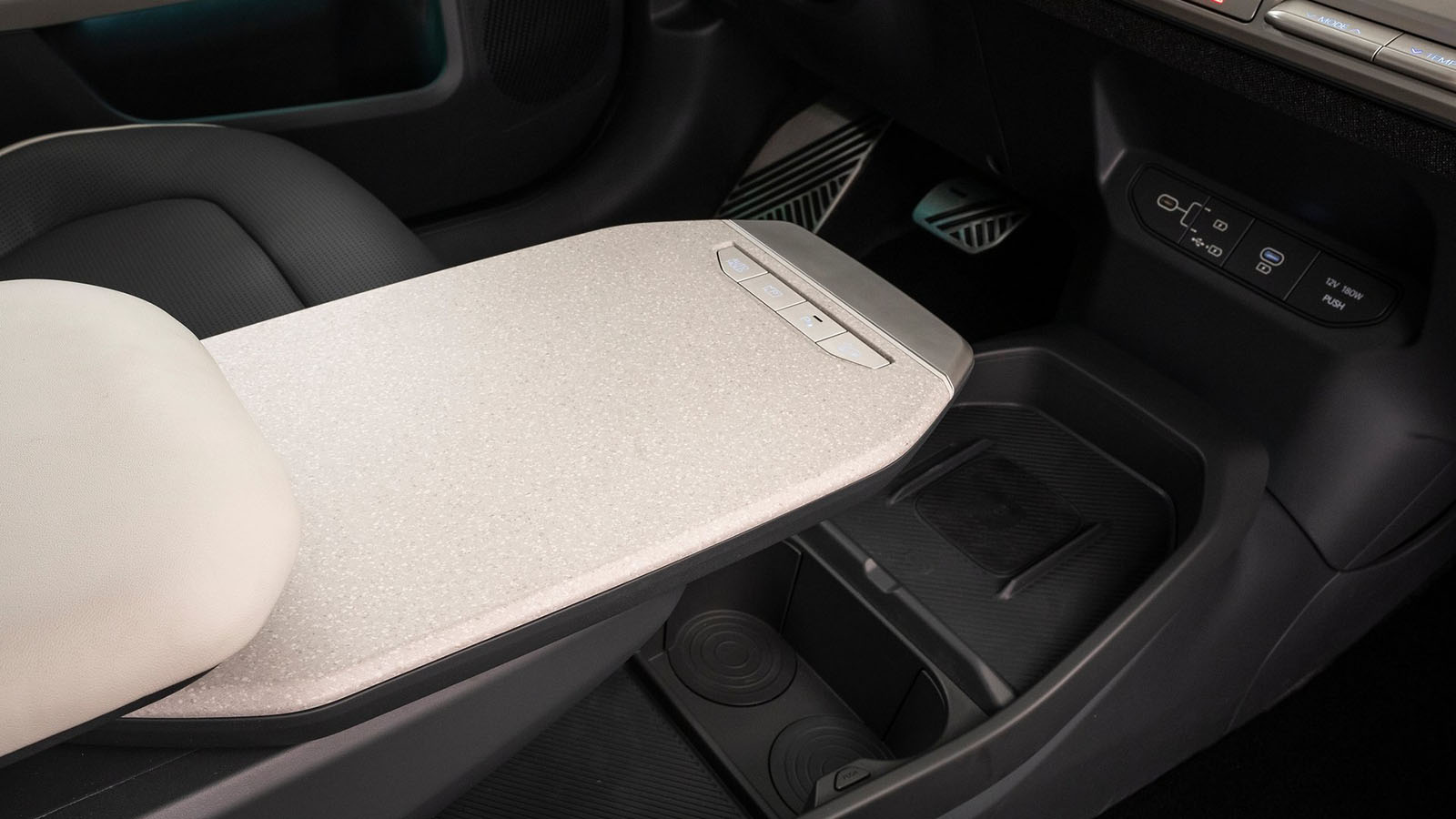 Una problemática que se debe, sobre todo, porque KIA ha optado por esta solución: la de tener una bandeja extraíble que nos sirva para trabajar o para poner el móvil e incluso para escribir que no todo va a ser digital. Si seguimos con este aspecto, tenemos muchos huecos portaobjetos en esta zona central, con un dos posavasos gigantes, este enorme hueco y la carga inalámbrica para móviles. Además, tenemos estos puertos USB para cargar otos dispositivos.