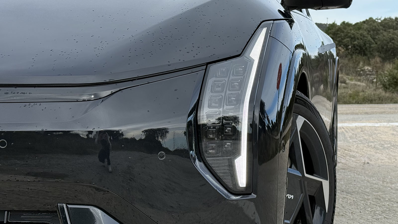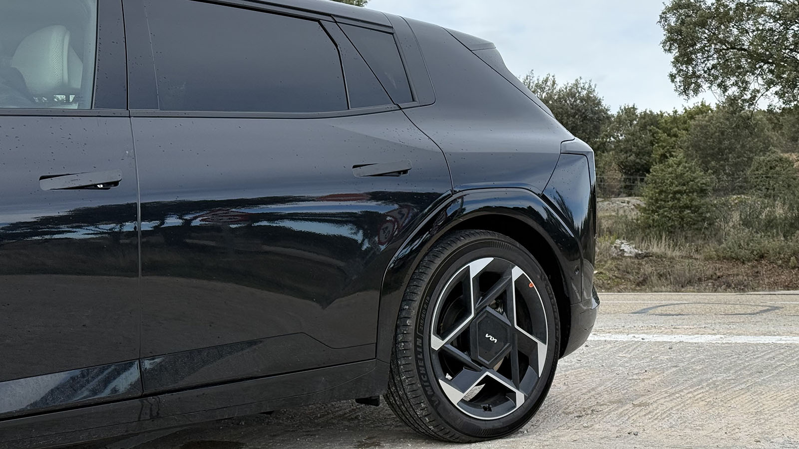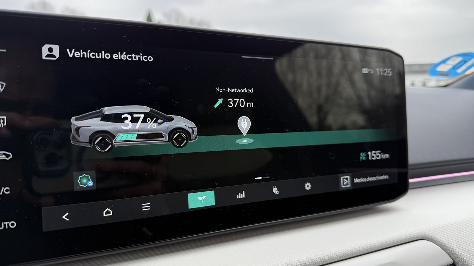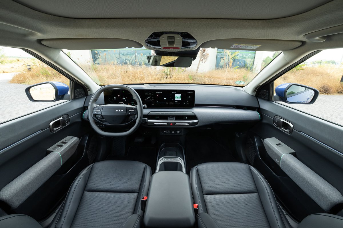 Una pantalla que, como en los EV9 y EV3, se fusiona con otras dos: una de 5,5 pulgadas para las funciones de la climatización, que resulta incómoda de manejar y de ver, al que le sigue un cuadro digital de 12,3 pulgadas con varias vistas. El comodín adicional lo proporciona el Head-up display proyectado en el parabrisas. Pese a toda esta digitalización, los botones físicos no se eliminan del todo y aunque algunos de ellos se incrustan en las molduras, tenemos otros para subir y bajar la temperatura así como otros en el reposabrazos central, a los que se suman los de volante que, por cierto, tiene un diseño de dos radios en los acabados Air y Earth o de tres en el GT-Line.