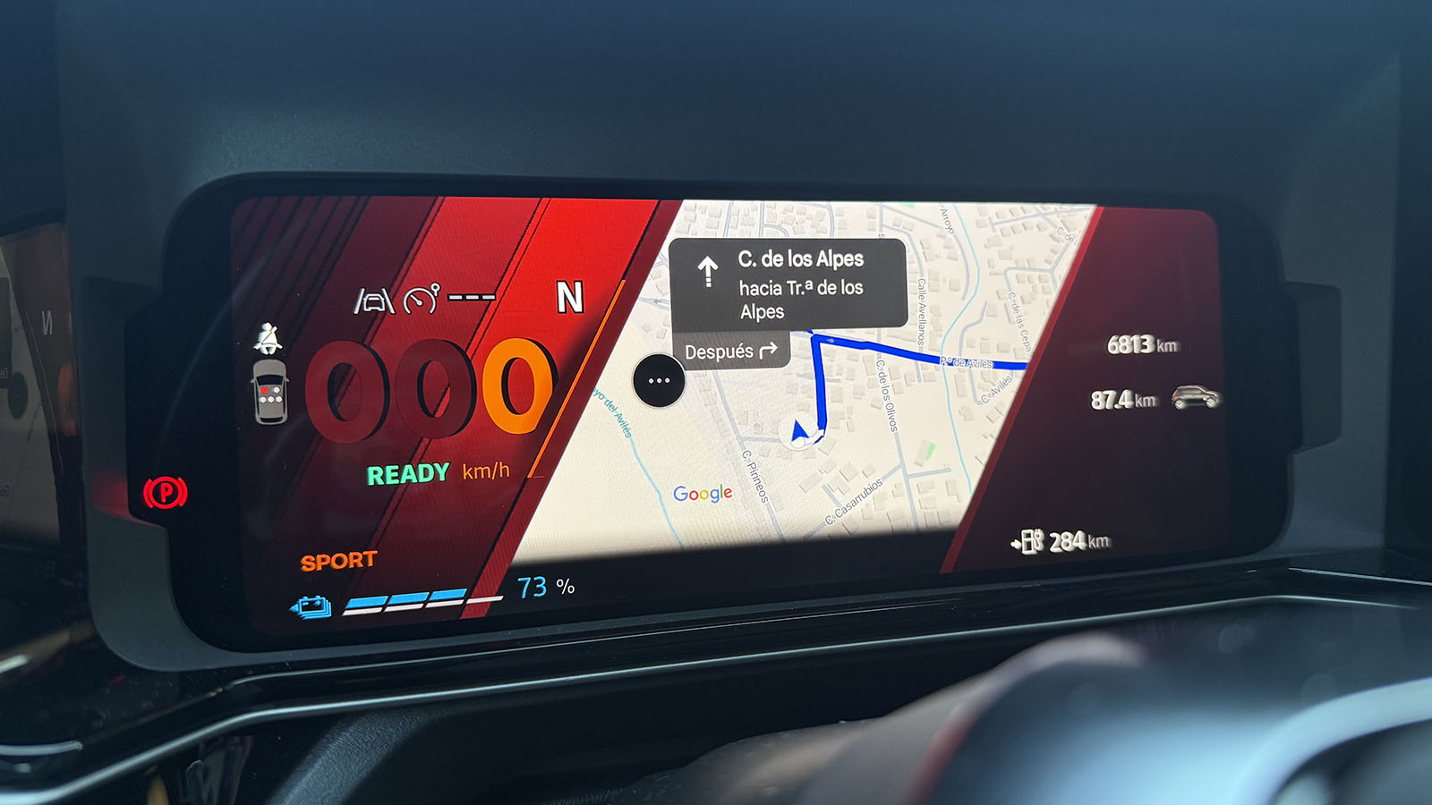 Así lo confirma con un doble monitor de 10 pulgadas que ofrece múltiples visualizaciones en el caso del cuadro de instrumentos y un sistema basado en Android Automotive en el del central. Gracias a ello y al soporte de Google, podemos contar con aplicaciones del gigante californiano como es el caso de Google Maps, en el que además se nos muestra el porcentaje de batería restante.